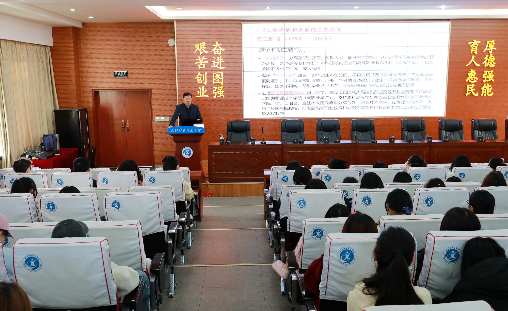 12月6日,张迪以“现代职业教育体系”为主题,主要从职业教育的回顾、职业教育的现状和职业教育的改革3个方面展开讲授。课堂上,张迪首先带领师生回顾职业教育的发展历程,深入浅出地分析了我国职业教育发展各阶段中存在的主要矛盾和矛盾的主要方面,从改革开放讲到党的二十大,通过阐述现状,总结特点,提出改革对策,不仅向师生展现出了我国职业教育发展的不凡之路,更是带领师生领略了党中央为职业教育发展擎画出灿烂辉煌的明天。课堂上既有国家政策的权威解读,又不乏大量案例的说理论证,思路开阔、逻辑清晰,内容丰富、知识量大,课堂气氛活跃。
