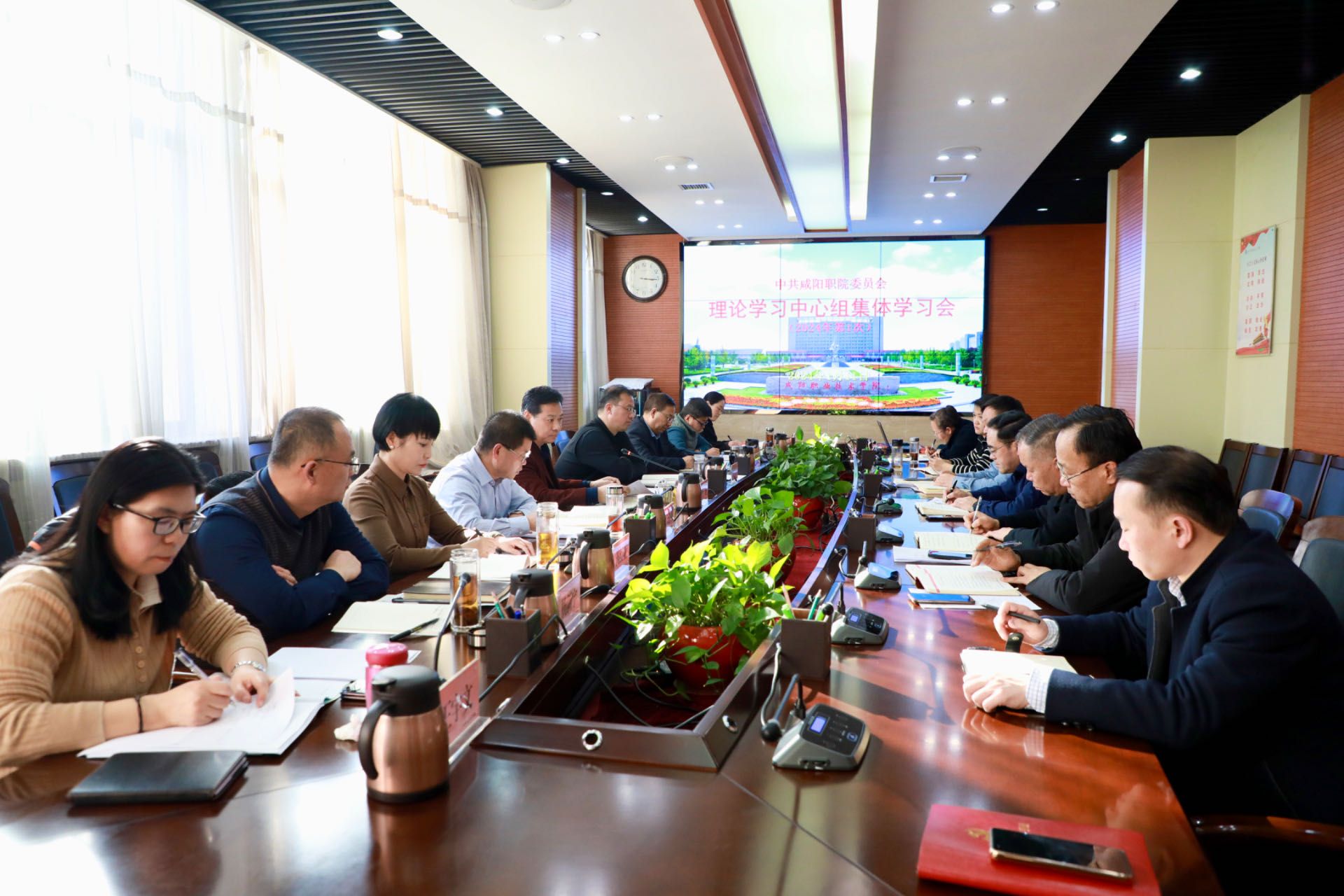 1月11日,咸阳职院党委召开2024年第1次理论学习中心组集体学习会。学院党委书记张迪,院长杨卫军,党委副书记张建刚,党委副书记、工会主席赵维,副院长芮红亚、王辉、杨新宇、吴旭锦,纪委书记王宇文及中心组成员参加学习会。