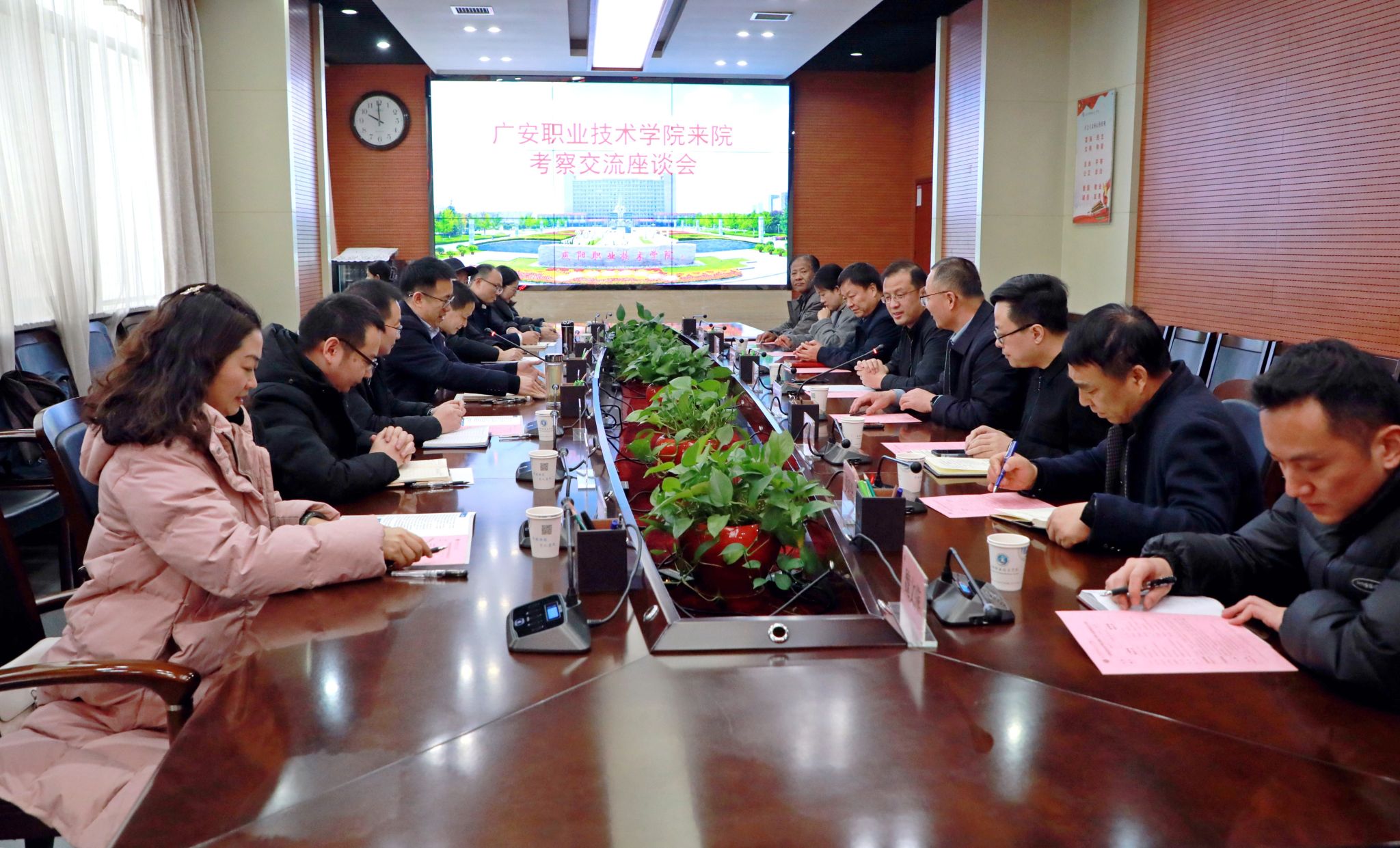 1月17日,广安职业技术学院党委副书记、校长王义全一行8人来咸阳职院考察交流。学院院长杨卫军、副院长杨新宇,组织人事处、双高建设办公室、教务处、就业与校企合作处、科研处、国际交流合作处负责人参加座谈会。