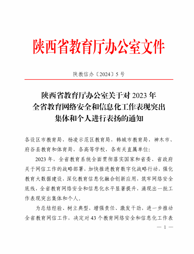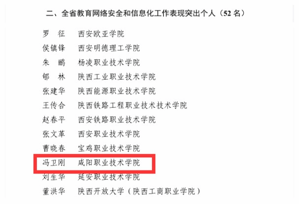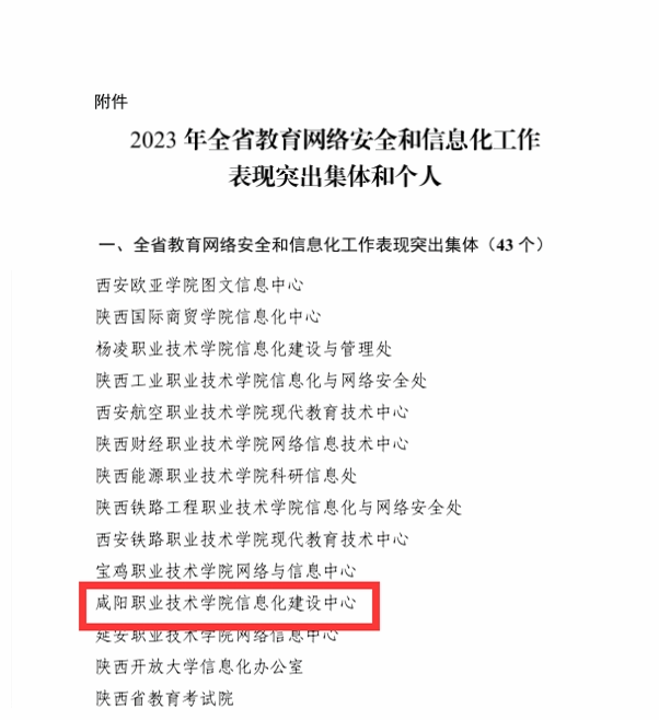 近日,中共陕西省委教育工委、陕西省教育厅印发了《关于对2023年全省教育网络安全和信息化工作表现突出集体和个人进行表扬的通知》(陕教信办〔2024〕5号),咸阳职院信息化建设中心荣获“2023年全省教育网络安全和信息化工作表现突出集体”称号,教师冯卫刚获突出个人称号。