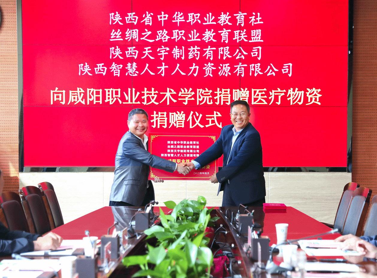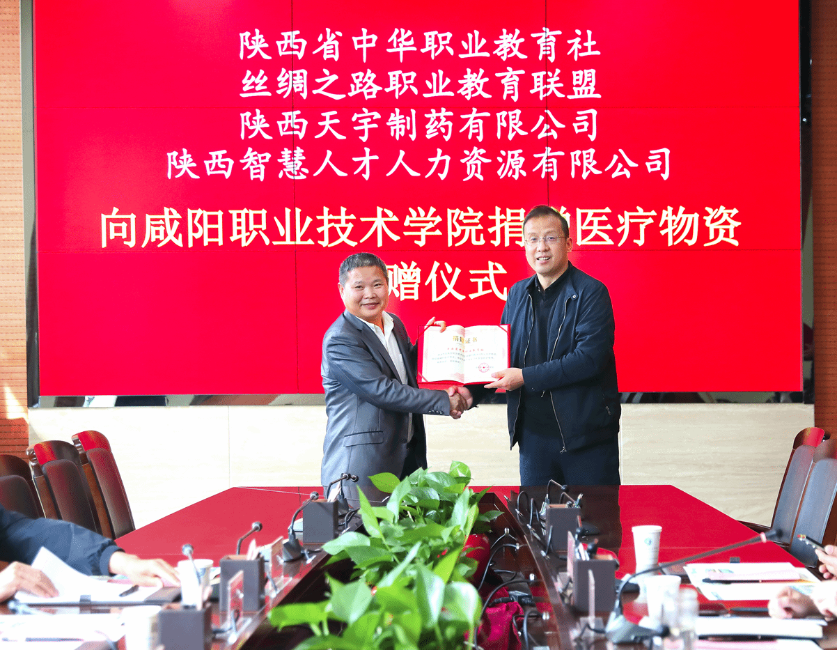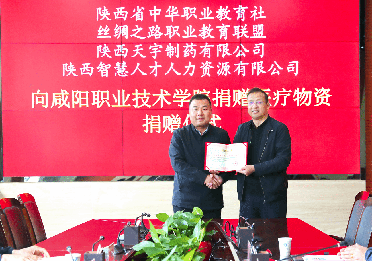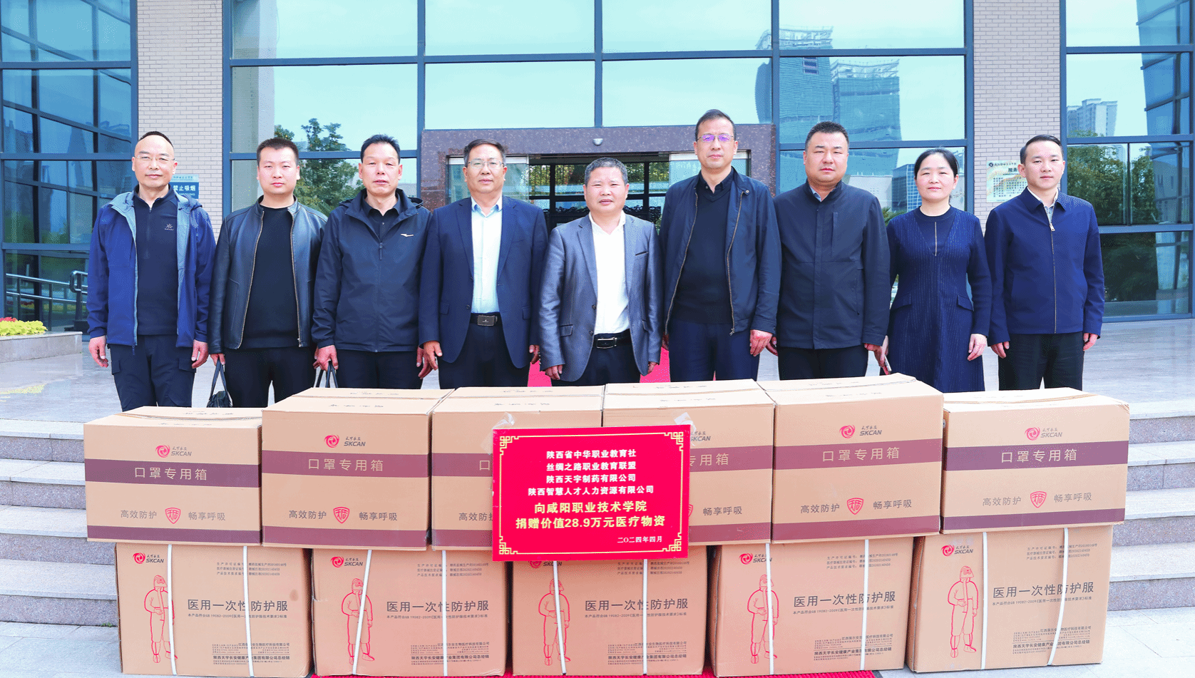 4月3日,陕西省中华职教社副主任、秘书长王彦平,丝绸之路职业教育联盟副秘书长、陕西智慧人才人力资源有限公司董事长丁旭谊等一行4人到咸阳职院,向学院捐赠价值28.9万元的卫生防护物资。学院院长杨卫军出席捐赠仪式并致辞,党委副书记、工会主席赵维、副院长吴旭锦出席活动。