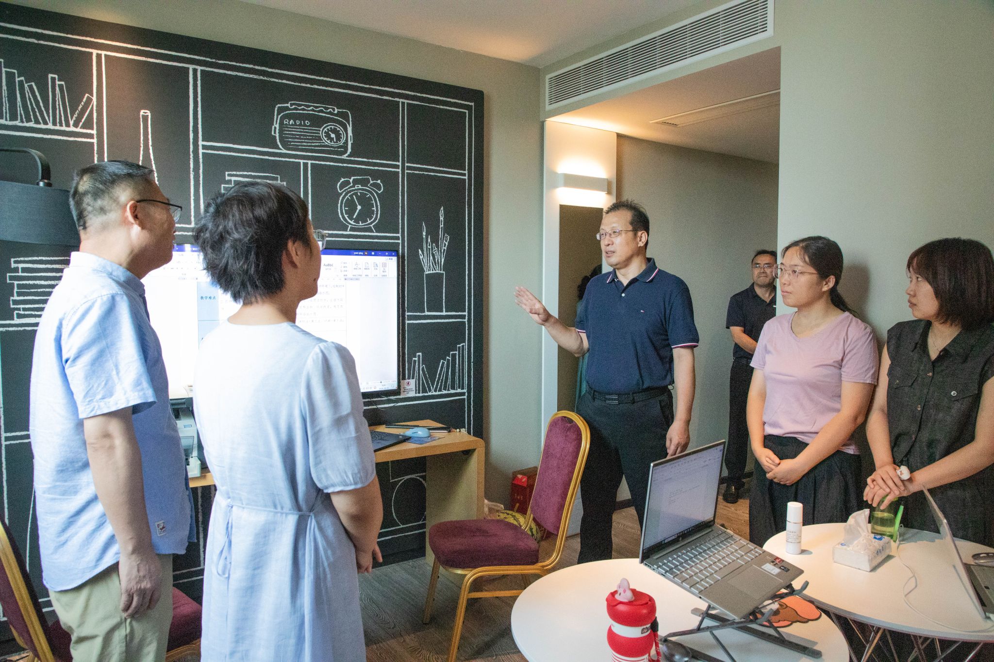 在教学能力大赛备赛现场,杨卫军与《数字人物设计与制作》《数字化农场网络部署》两个团队的参赛教师亲切交谈,仔细询问备赛情况,勉励大家继续保持积极的备赛状态,注意劳逸结合,保证以最佳的身心状态参加比赛。