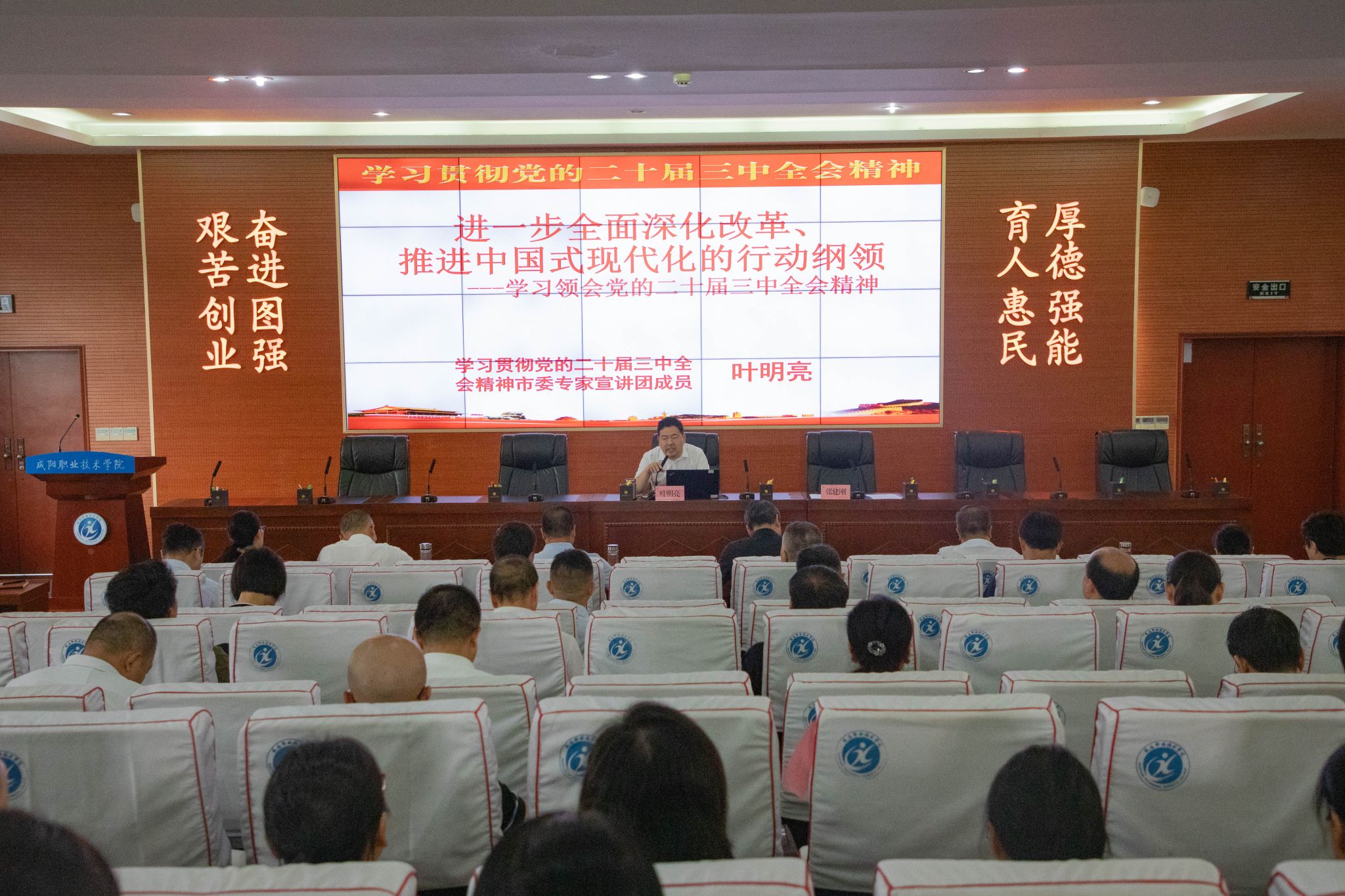 咸阳市委党校叶明亮教授以“进一步全面深化改革、推进中国式现代化的行动纲领”为题,从充分认识进一步全面深化改革的重大意义、深刻领会进一步全面深化改革的总体要求、全面准确把握好《决定》提出的重大举措、全力以赴抓好《决定》改革部署贯彻落实等四个方面,宣讲了党的二十届三中全会精神内涵,具有很强的政治性、思想性、实践性,对全体党员干部完整、准确、全面学习领会全会精神,持续推进现代化职业教育体系改革具有十分重要的指导意义。