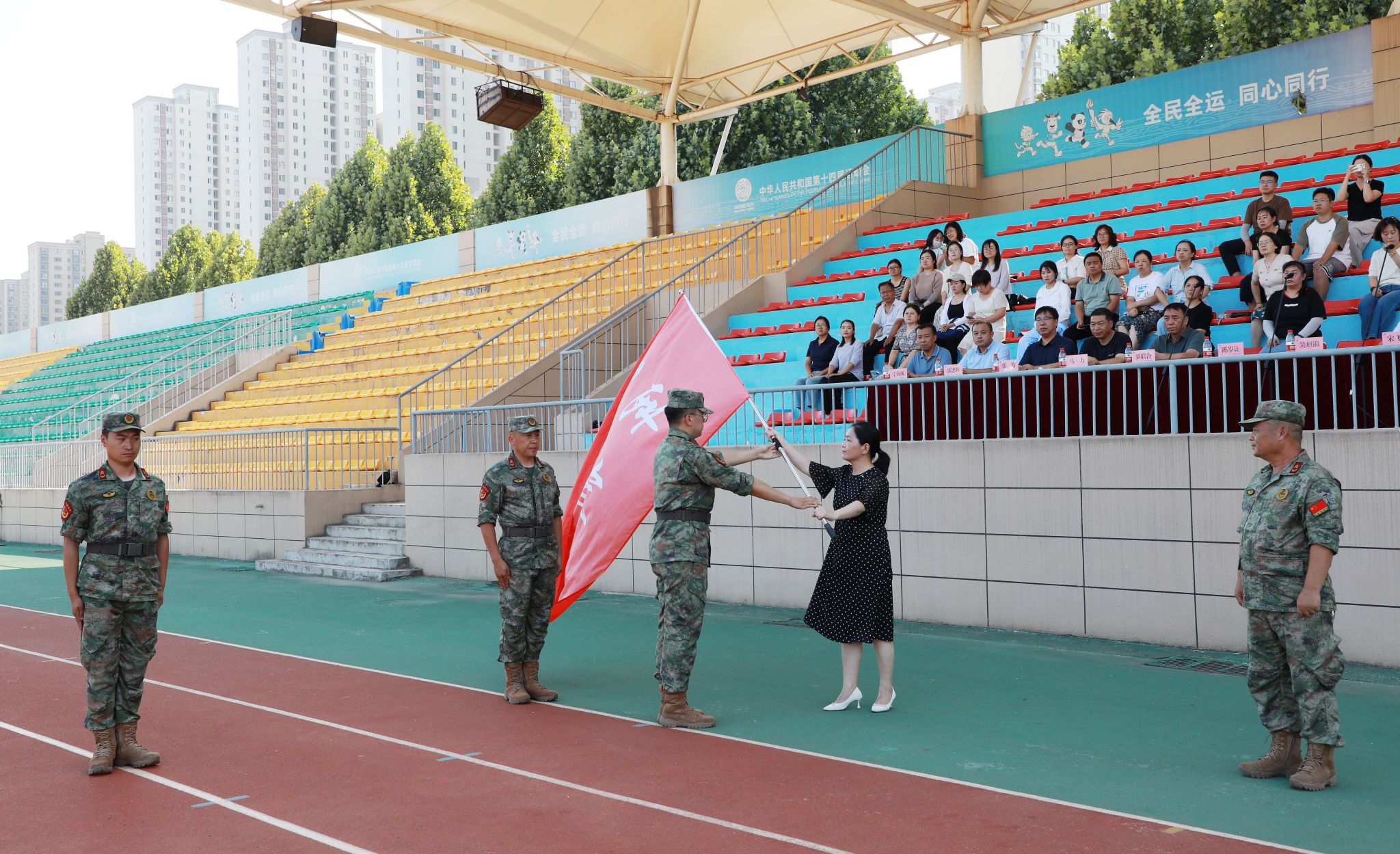吴旭锦向军训团授旗,宣布2024级新生军训正式开始。