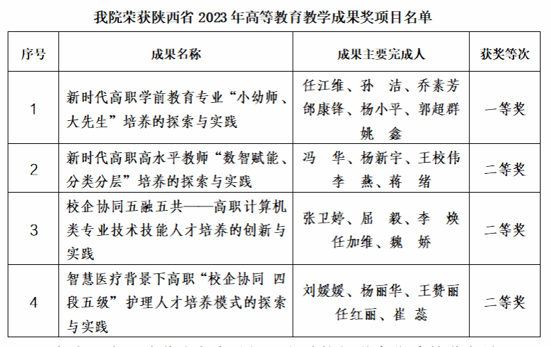 近日,陕西省人民政府办公厅公布了《关于表彰2023年高等教育教学成果奖获奖项目的通报》(陕政办函〔2024〕104号),咸阳职院4项教学成果荣获省级教学成果奖。其中师范学院任江维主持的《新时代高职学前教育专业“小幼师、大先生”培养的探索与实践》荣获一等奖。教务处冯华主持的《新时代高职高水平教师“数智赋能、分类分层”培养的探索与实践》、信息工程学院张卫婷主持的《校企协同五融五共——高职计算机类专业技术技能人才培养的创新与实践》、医学院刘媛媛主持的《智慧医疗背景下高职“校企协同 四段五级”护理人才培养模式的探索与实践》3项成果荣获二等奖。
