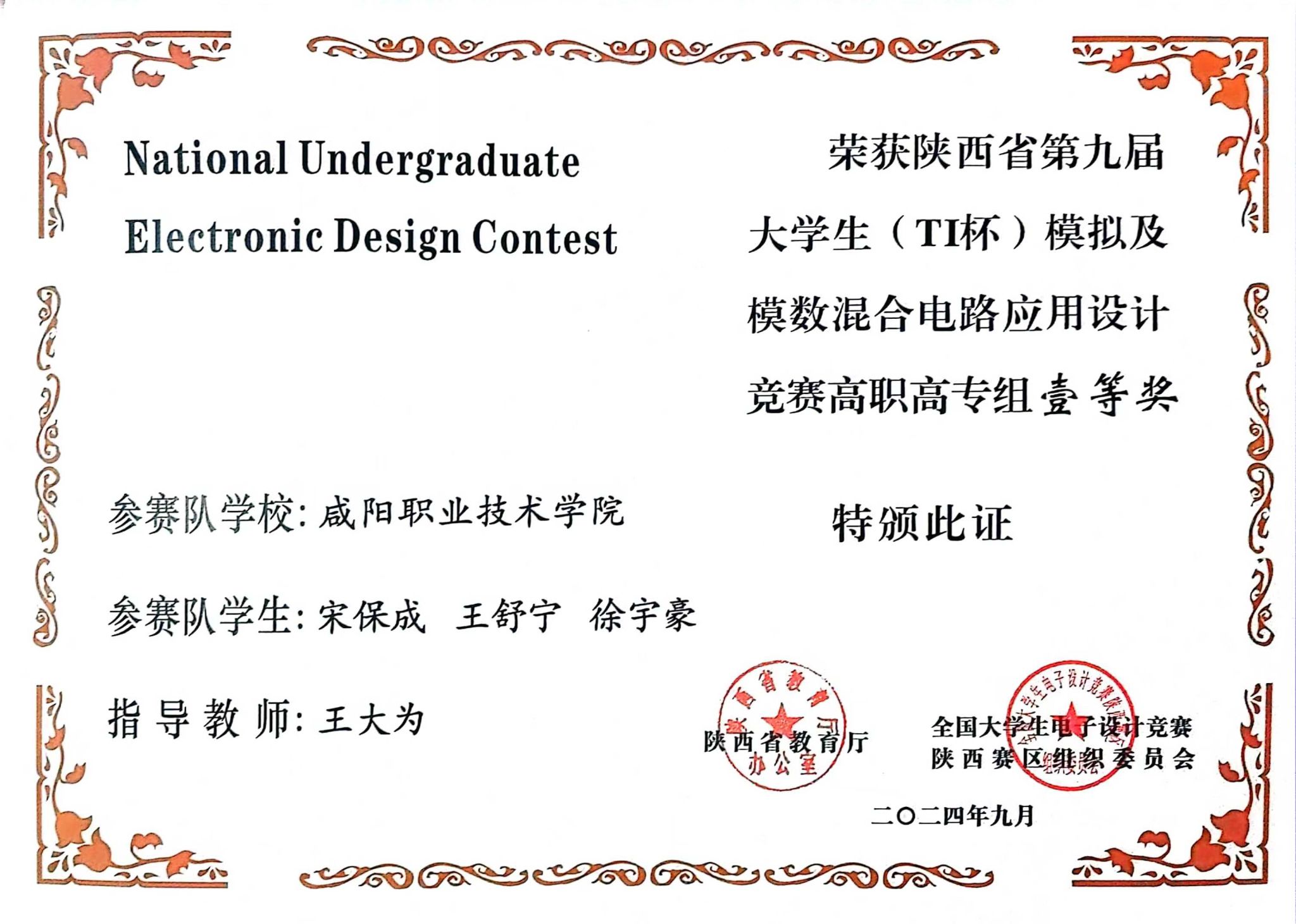 近日,由陕西省教育厅主办、西安电子科技大学承办的陕西省第九届大学生(TI杯)模拟及模数混合电路应用设计竞赛圆满结束,咸阳职院信息工程学院教师王大为指导的宋保成、王舒宁、徐宇豪学生代表队荣获高职高专组一等奖。