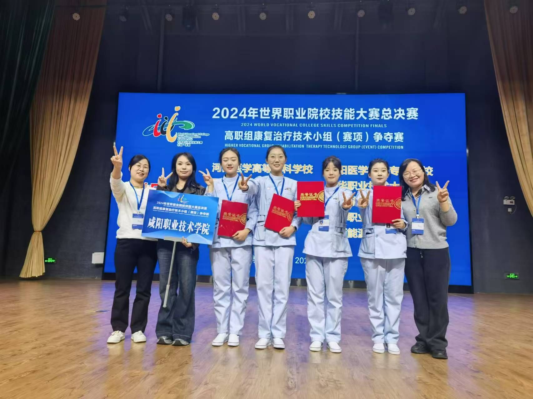 10月28日-10月31日,2024年世界职业院校技能大赛总决赛医药卫生赛道四康复治疗技术小组(赛项)争夺赛在湖北职业技术学院举行,咸阳职院医学院参赛学生曹雅婷、李思懿、刘玉洁、郭佳怡,在王旭兰、马新红、叶倩等三位老师指导下取得了银奖。