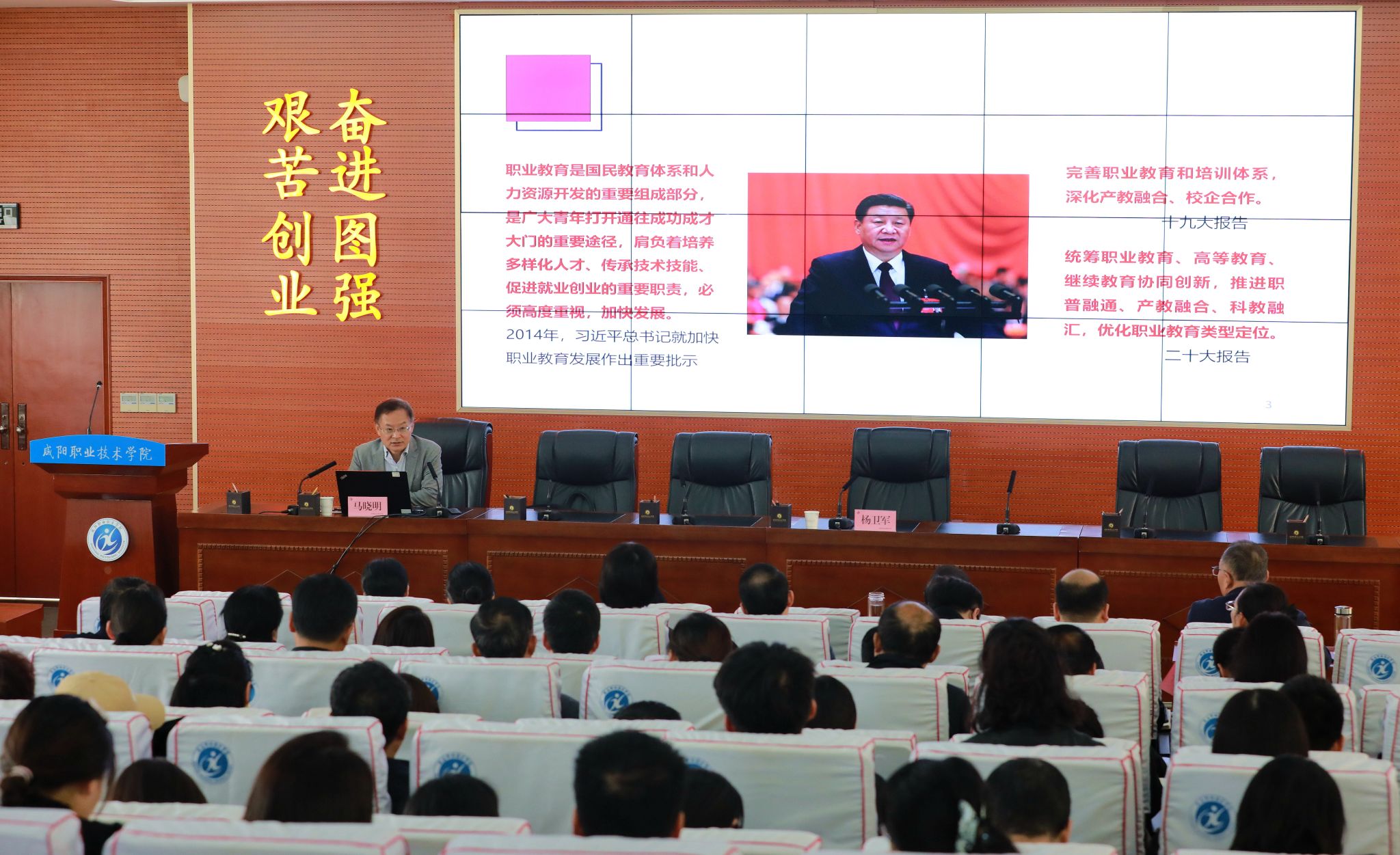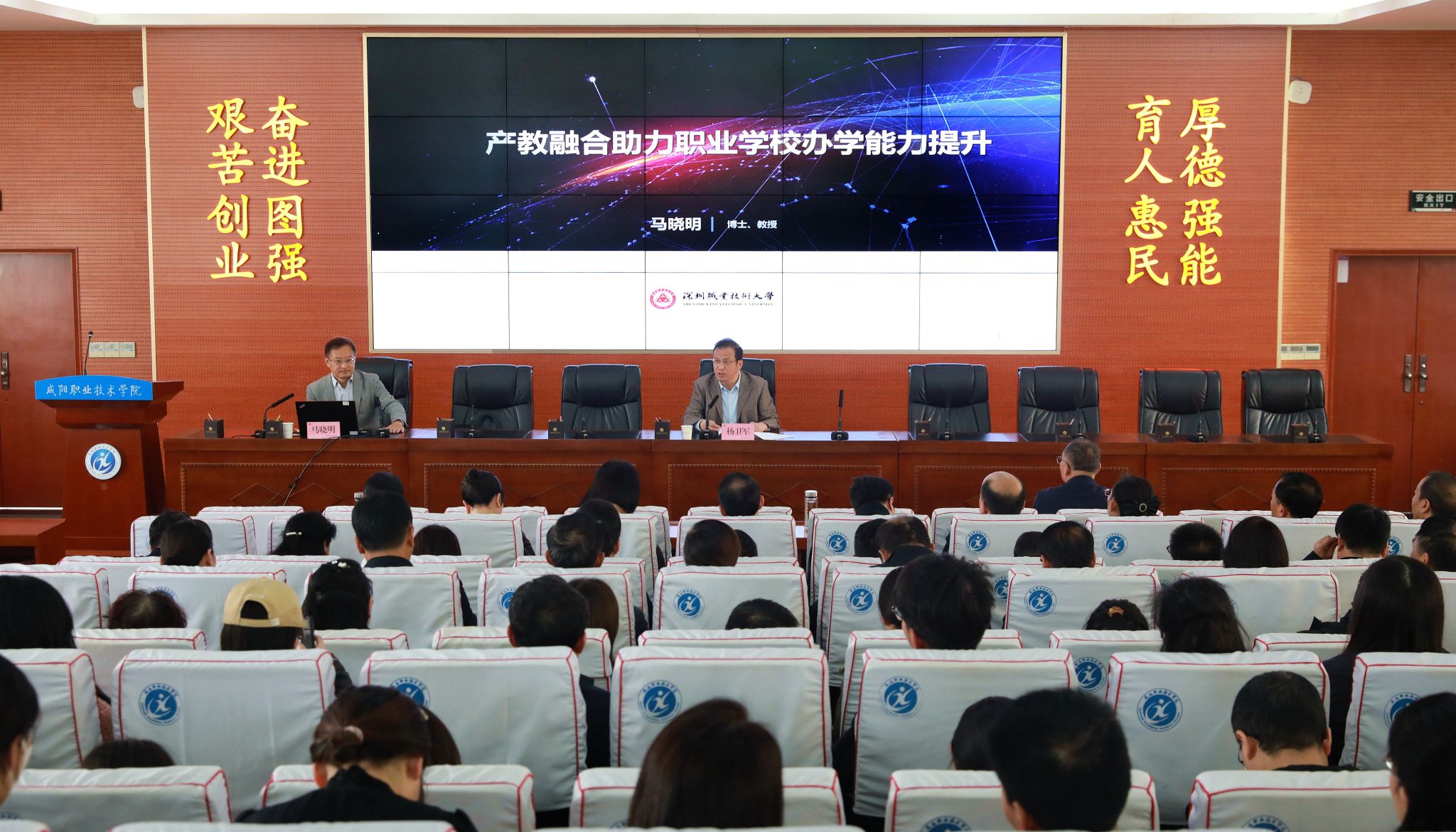 11月8日,咸阳职院特邀深圳职业技术大学原副校长马晓明教授作“产教融合助力职业院校办学能力提升”专题报告。学院院长杨卫军,副院长杨新宇、吴旭锦,各二级学院、处室负责人,副教授以上职称教师等人员参会。报告会由院长杨卫军主持。
