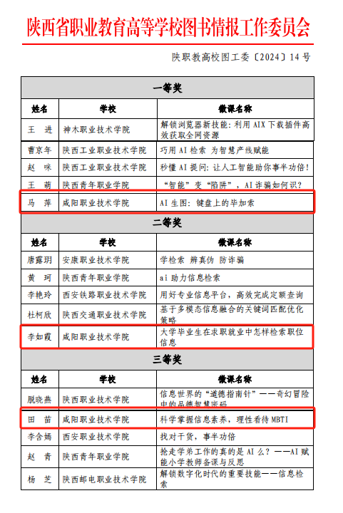 11月15日,由陕西省职业教育高等学校图书情报工作委员会主办的2024年陕西省高职高专院校信息素养大赛暨“中文在线杯”第六届全国大赛选拔赛结果正式公布,咸阳职院3名教师在本次大赛中荣获佳绩,beat365正版唯一官网荣获优秀组织奖。
