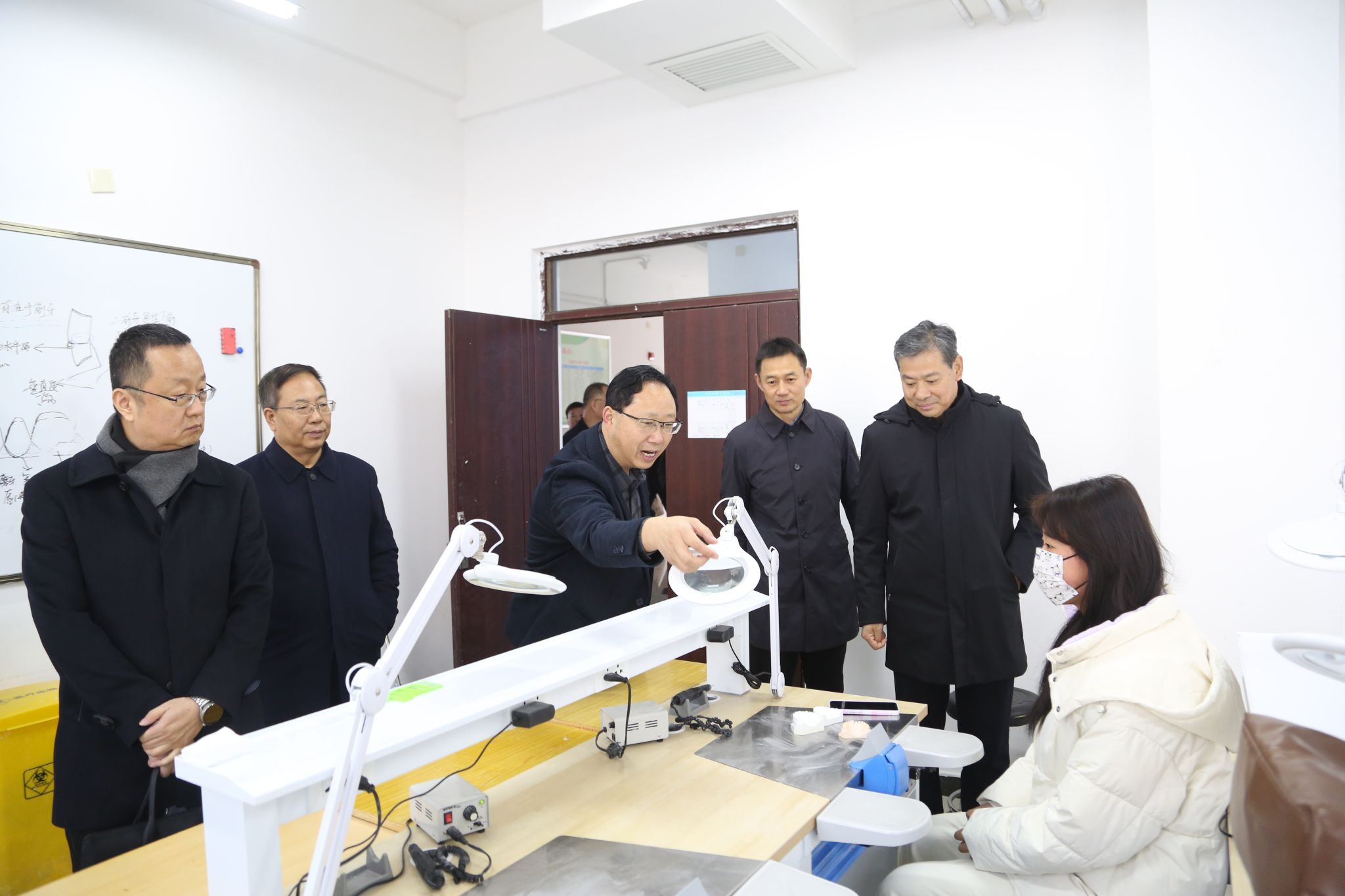 张迪一行实地考察了商洛职院校史馆、国家级高技能(康养高技能)人才培训基地、护理学院和医学院实验实训室等场所,详细了解了商洛职院发展历史、内涵建设、产教融合、办学运行等方面情况。在座谈会上,双方围绕党的建设、“三教”改革、人事制度改革、教师培养体系、医学类专业群建设等方面进行了深入交流。