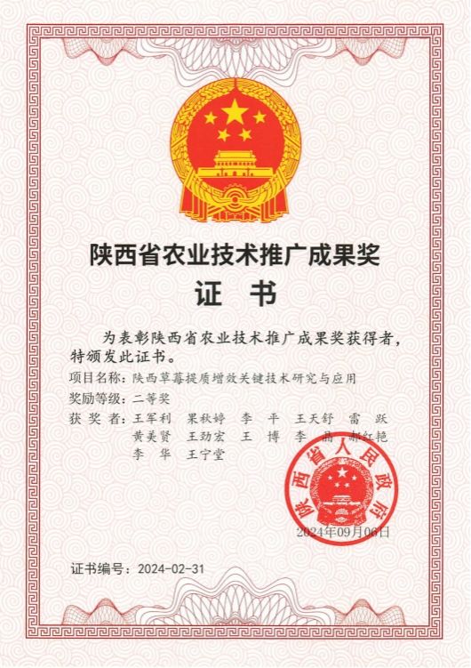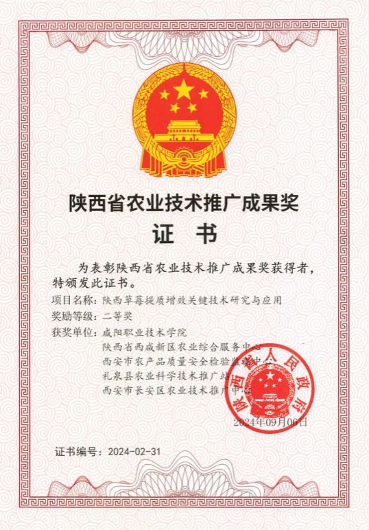 近日,陕西省人民政府办公厅发布了《陕西省人民政府关于表彰全省农业技术推广成果奖的通报》(陕政办函[2024]107号),咸阳职院王军利教授团队的“陕西草莓提质增效关键技术研究与应用”项目荣获二等奖。