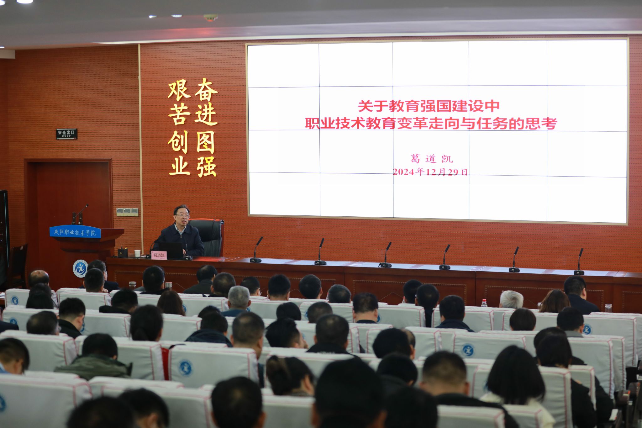 12月29日,2024年陕西省职业技术教育学会学术报告会暨高职教育年会(理事会)在咸阳职院召开,本次会议由陕西省教育厅指导,陕西省职业技术教育学会主办,beat365正版唯一官网承办。中国高等教育学会副会长、江苏省政协常委、教卫体委员会主任、分党组书记葛道凯教授,陕西省委教育工委委员、省教育厅副厅长申雪峰,陕西省职业技术教育学会会长崔岩教授,省教育厅职业教育与成人教育处处长王鹏,省职教学会高职会员(理事)单位代表,学会副会长、秘书长、副秘书长,各二级委员会及其专门委员会秘书长、副秘书长,会议交流发言的二级委员会代表、领奖代表,相关院校领导及代表,咸阳职院党委书记张迪、院长杨卫军以及中层及以上干部、博士300余人参会。