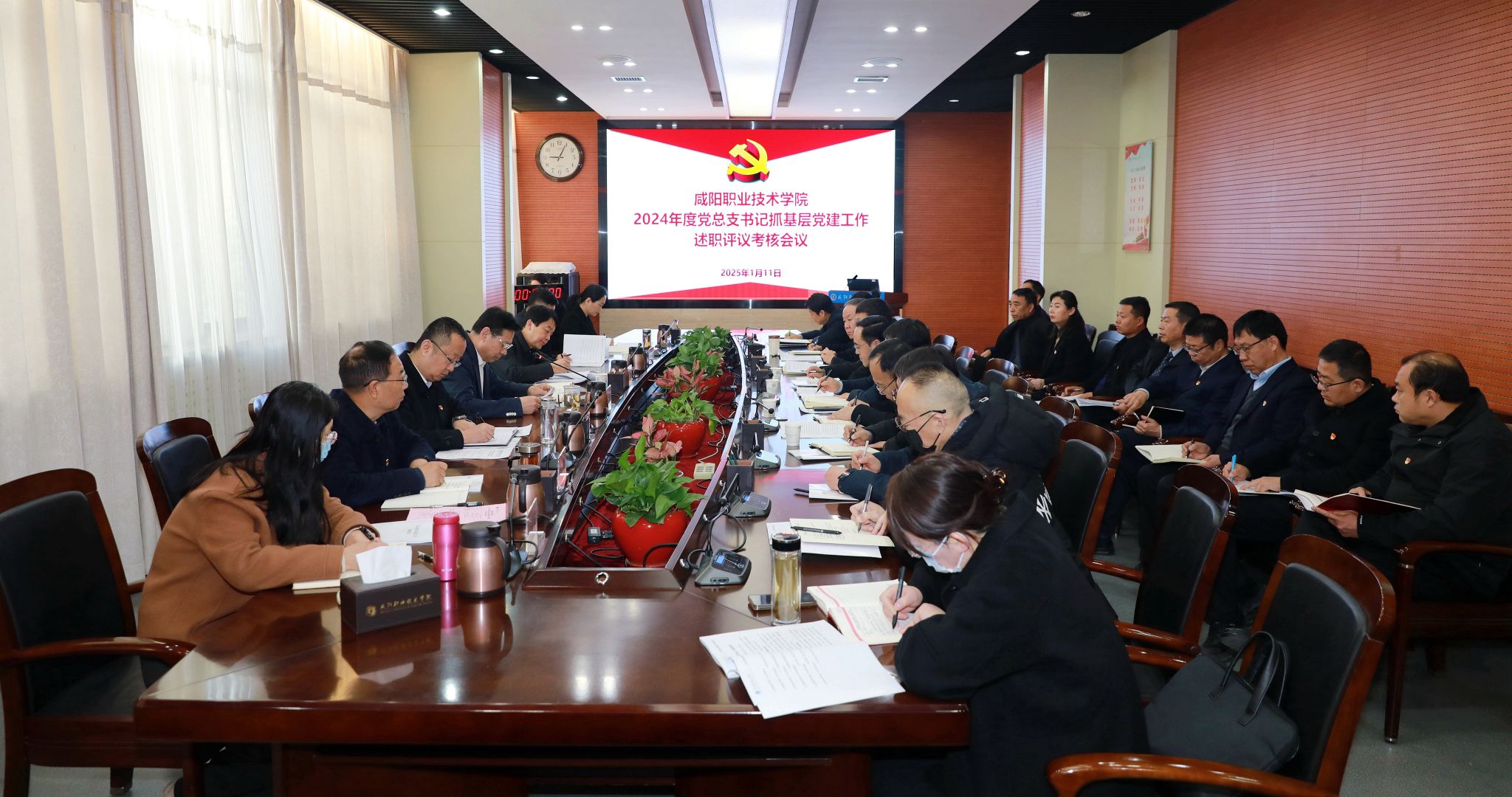 1月11日,咸阳职院党委召开2024年度党总支书记抓基层党建工作述职评议考核会议,深入贯彻习近平总书记关于党的建设的重要思想,认真落实市委抓基层党建述职评议考核会议精神,听取各党总支书记抓基层党建工作情况,安排部署2025年度基层党建工作任务。学院党委书记张迪主持会议,市委组织部派员到会指导,学院党委班子成员孙彦彬、赵维、吴旭锦、王宇文参加会议。