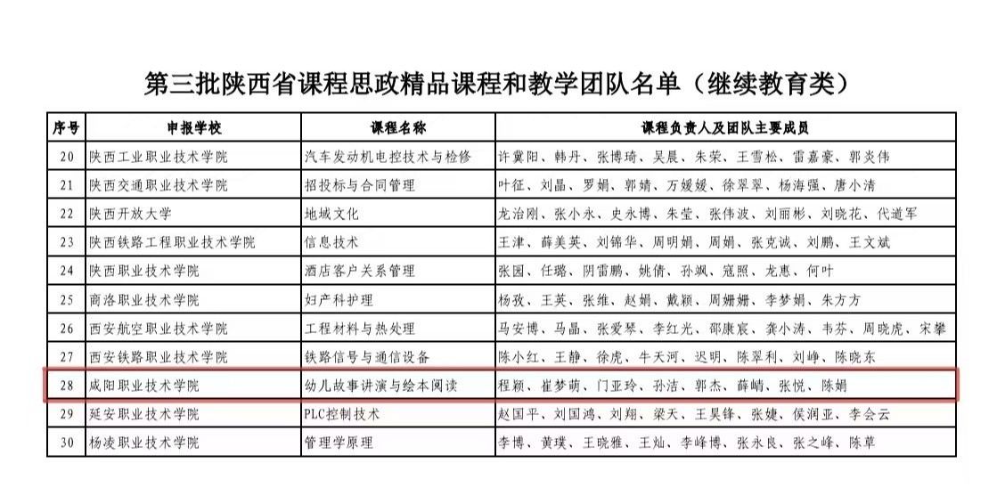 近日,陕西省教育厅公布了第三批陕西省课程思政精品课程和教学团队的认定结果,我院继续教育类课程《幼儿故事讲演与绘本阅读》获第三批陕西省课程思政精品课程和教学团队认定。