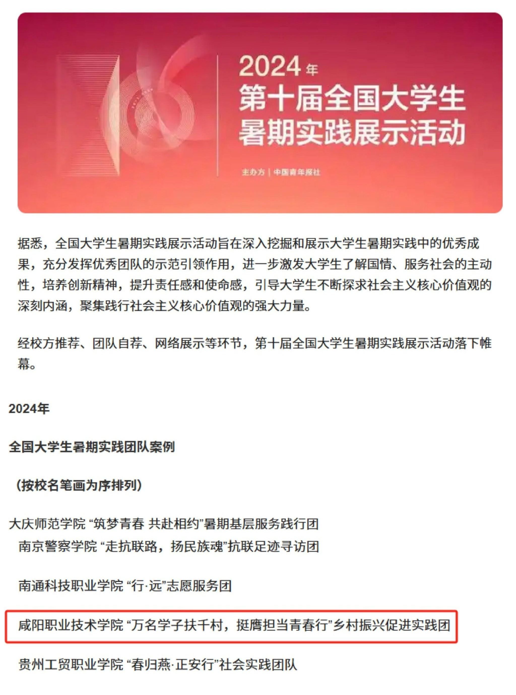 近日,由中国青年报主办的2024年第十届全国大学生暑期实践展示活动评选结果揭晓,我院“万名学子扶千村,挺膺担当青春行”乡村振兴促进实践团成功入选“全国大学生暑期实践团队案例”,也是我院首次入选该项活动。