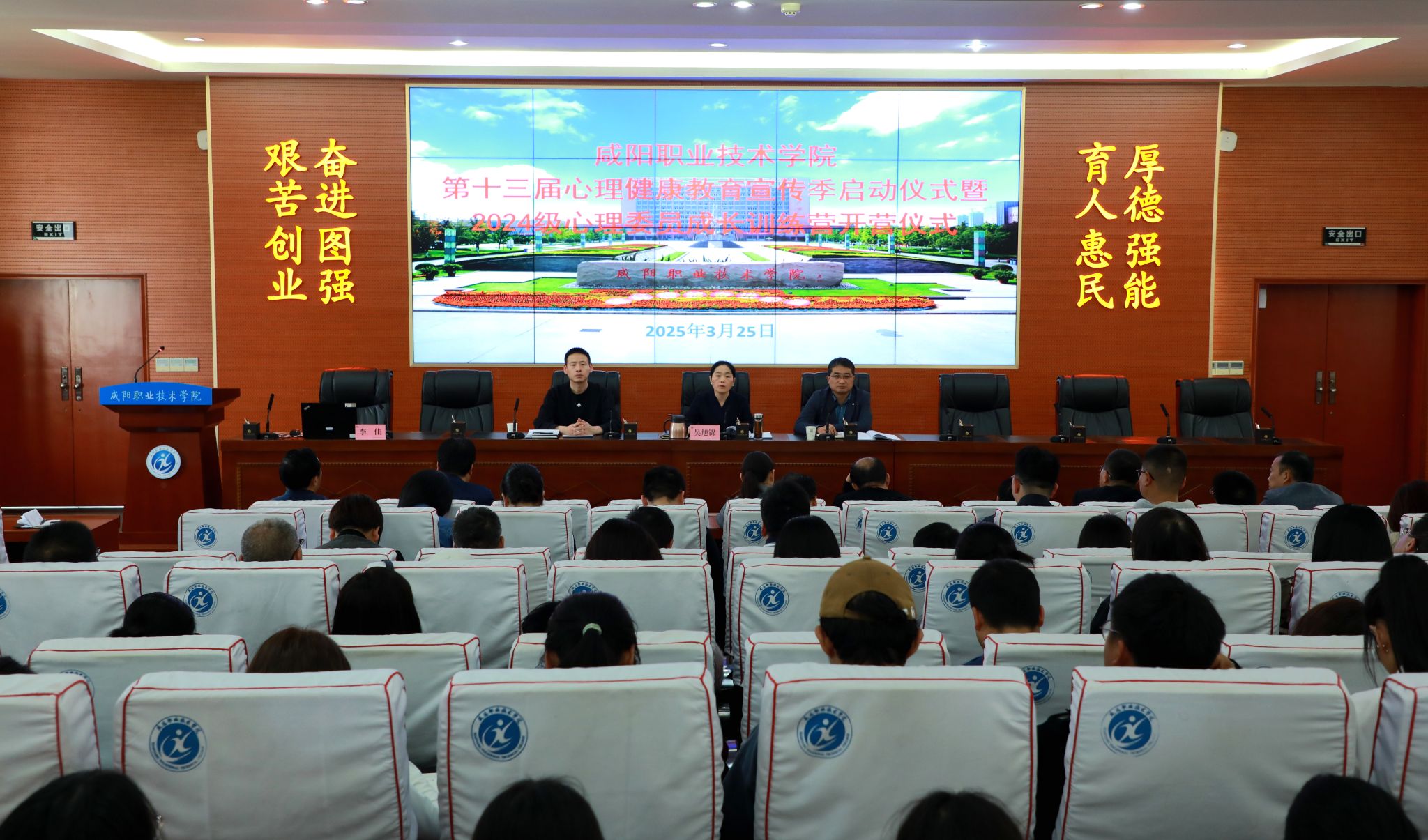 3月25日,咸阳职院第十三届心理健康教育宣传季启动仪式暨2024级心理委员成长训练营开营仪式在院务楼201报告厅举行。学院副院长吴旭锦,学生处负责人,各二级学院党总支书记、副书记、学发办主任,学生处全体工作人员,心理工作教师,辅导员代表,2024 级全体班级心理委员参加。