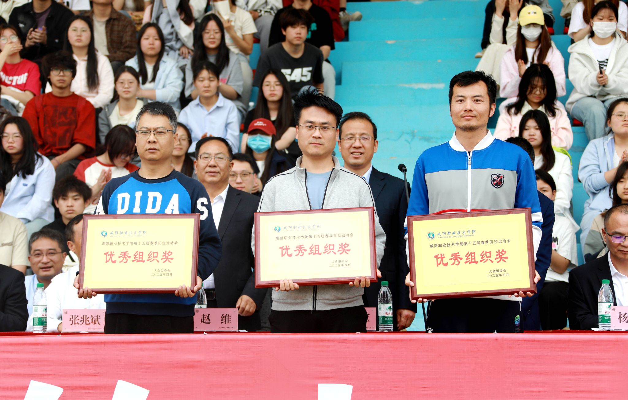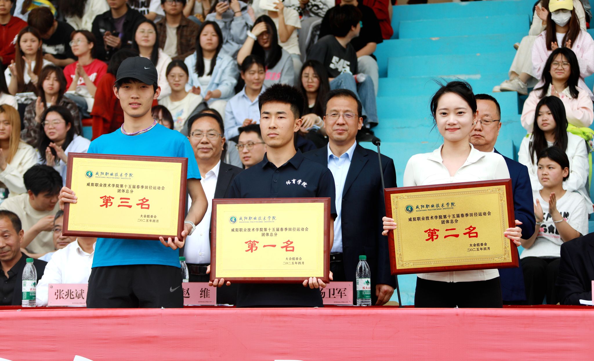 经过两天的激烈角逐,4月11日下午,咸阳职院第十五届春季田径运动会顺利完成各项规定赛程,圆满落下帷幕。学院院长杨卫军宣布运动会闭幕,党委副书记、工会主席孙彦彬致闭幕词,党委副书记赵维宣读获奖名单,副院长杨新宇主持会议。各二级学院、处室党政负责人参加闭幕式。