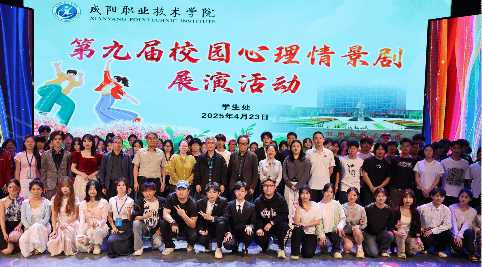 4月23日,咸阳职院第九届校园心理情景剧展演活动在大学生活动中心演播大厅圆满落幕。学院副院长吴旭锦,学生处处长及全体工作人员,各二级学院党总支书记、副书记、学发办主任、心理辅导员和学生代表共计500余人一同观看展演。