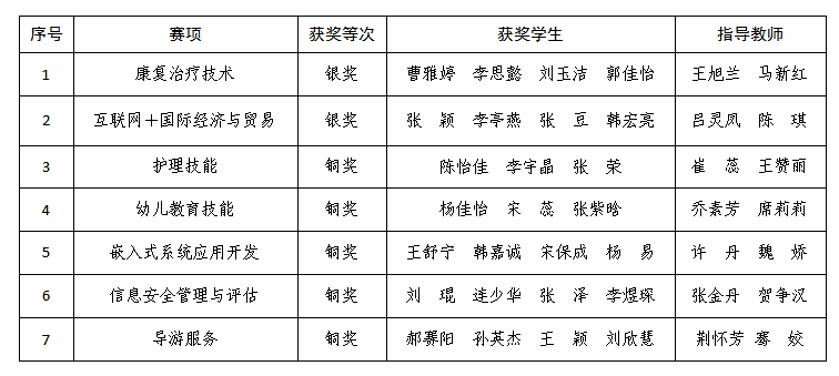 近日,教育部公布了《2024年世界职业院校技能大赛获奖名单的通知》(教职成函〔2025〕2号),咸阳职院共有7个赛项获奖,其中康复治疗技术、互联网+国际经济与贸易2个赛项获银奖,护理技能、幼儿教育技能、嵌入式系统应用开发、信息安全管理与评估、导游服务5个赛项获铜奖。