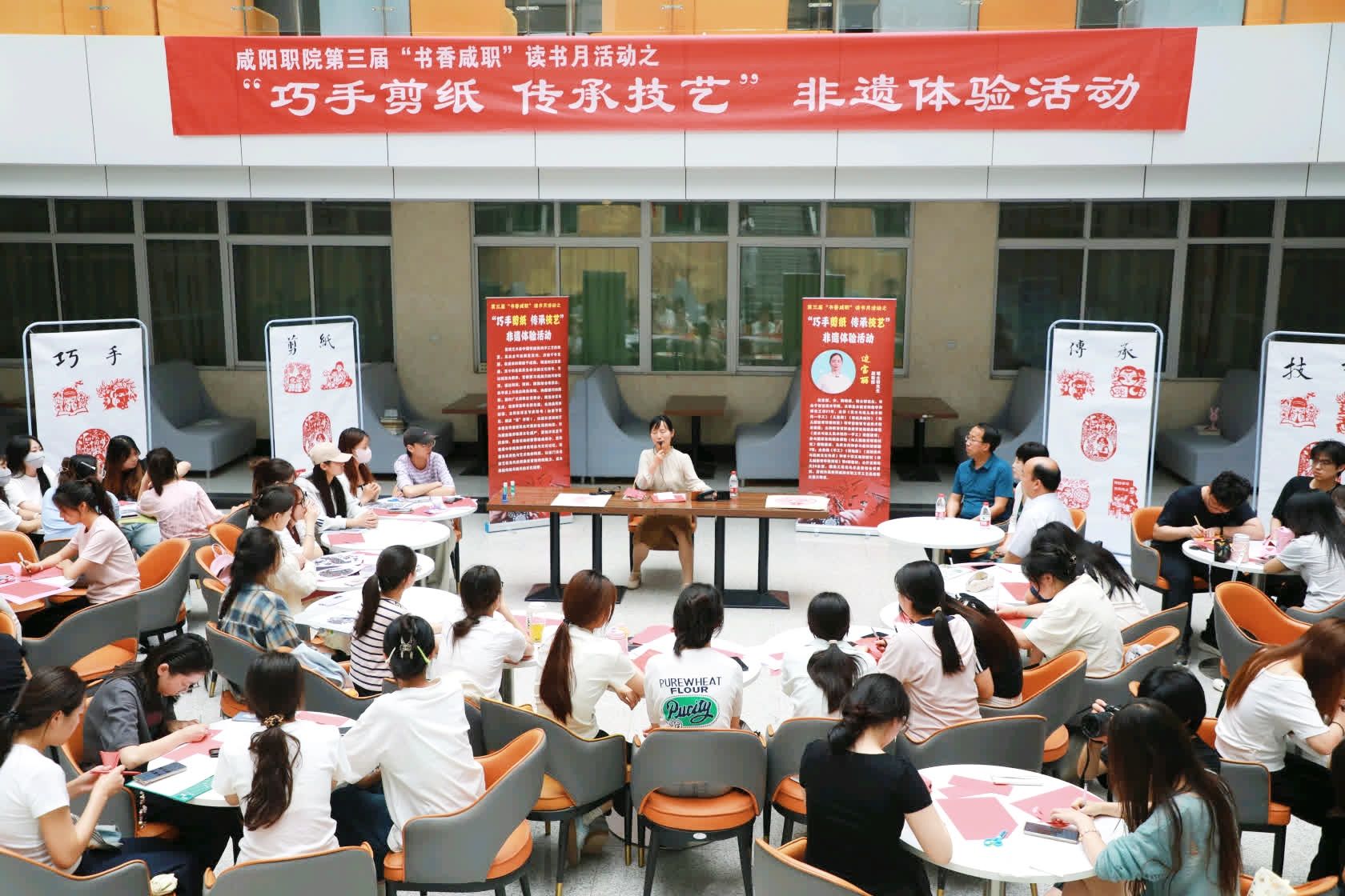 为弘扬中华优秀传统文化,推动非遗技艺在校园内的传承与发展,5 月 8日,咸阳职院第三届“书香咸职”读书月活动之“巧手剪纸 传承技艺”非遗体验活动在仪祉图书馆成功举办。本次活动由仪祉图书馆和师范学院联合策划,以独特的指尖艺术,奏响了青春传承传统文化的美妙乐章。学院副院长芮红亚,仪祉图书馆、纪委等部门负责人及师生参与活动。