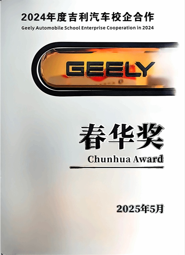 2024年度校企合作“春华奖”是吉利汽车对合作院校在人才培养、技术创新等方面的充分肯定。接下来,学院将持续深化与吉利汽车集团的合作交流,协同企业开展就业育人项目,共同推进专业建设、师资建设、基地建设、优质就业等多方面的深入合作,开启学校与吉利汽车集团高质量合作新征程。