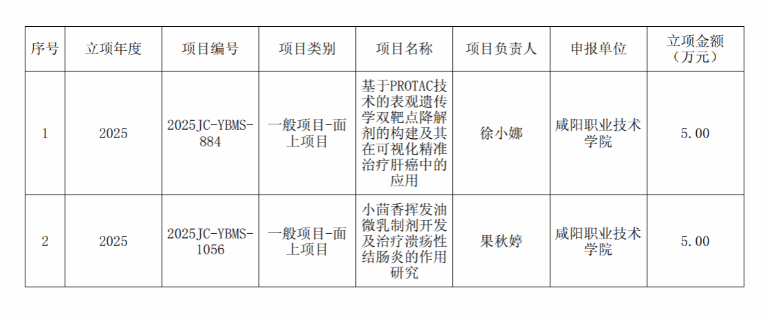 近日,陕西省科技厅正式发布2025年度科技计划项目立项结果,咸阳职院申报的2个科研项目成功入选,共获得10万元科研经费支持。这是我院在医药健康领域科研实力的又一次彰显。