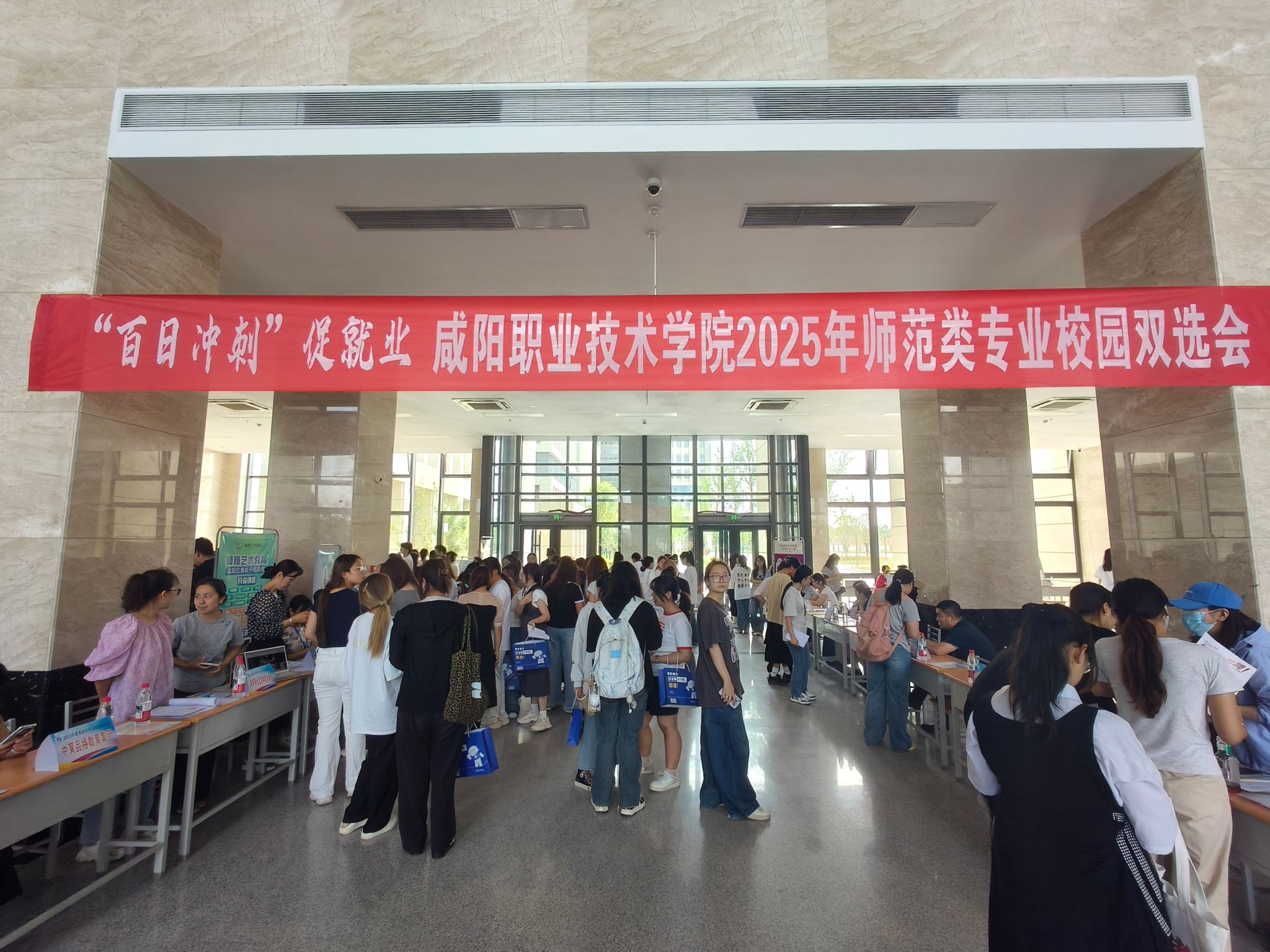5月23日,咸阳职院师范学院联合小学教育学院举办2025年师范类专场校园双选会。双选会邀请50余家优质幼儿园、早教机构、教育集团参加,为300余名毕业生搭建优质就业平台。学院副院长吴旭锦,就业与校企合作处、学生处、师范学院、小学教育学院党政负责人,全体毕业班辅导员参加本次活动。