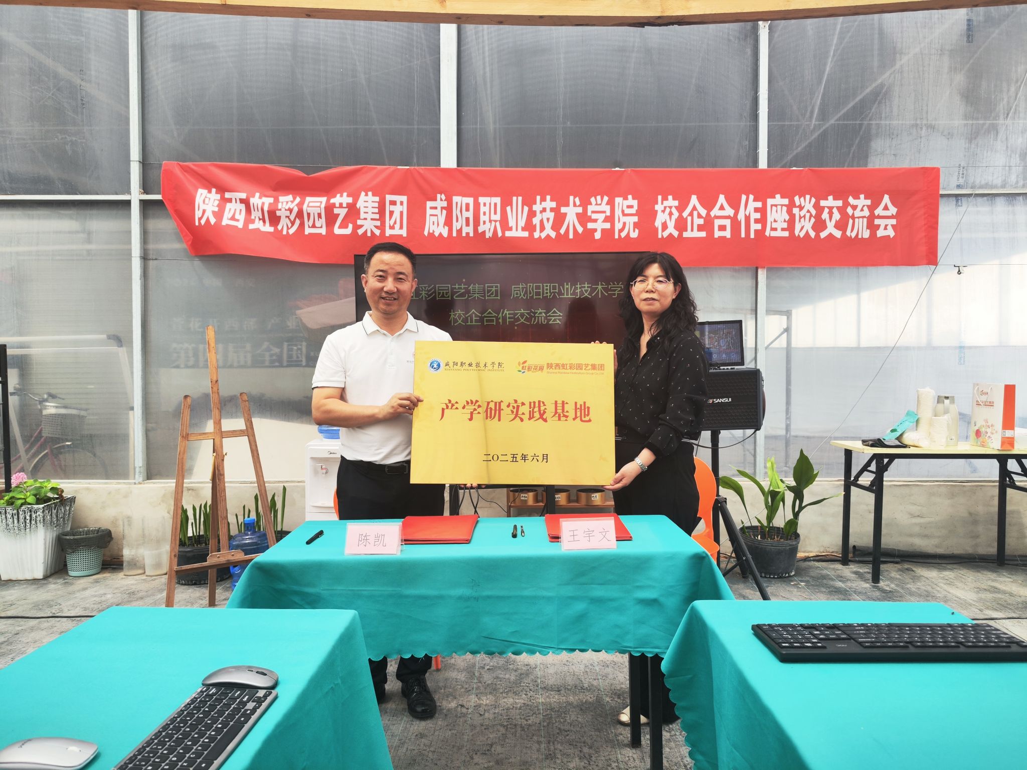 6月4日上午,咸阳职院纪委书记王宇文带领仪祉农林学院负责人及教师代表赴陕西虹彩园艺集团有限公司开展访企拓岗促就业专项行动,并举行校企合作签约暨园林技术专业“产学研实践基地”挂牌仪式。