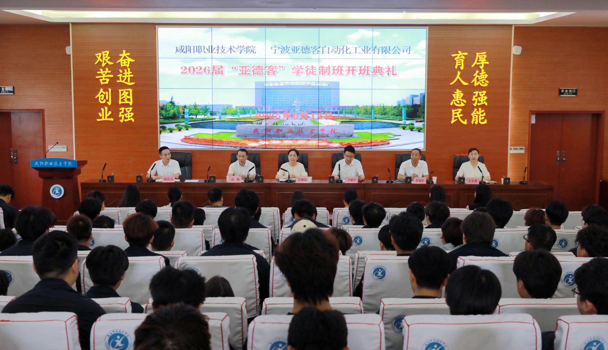 6月12日,beat365正版唯一官网2026届“亚德客”学徒制班开班典礼在学院201报告厅举行。学院副院长吴旭锦、宁波亚德自动化工业有限公司技术主管王亚军、工程师柘长青出席典礼,就业与校企合作处、机电(技师)学院负责人及68名学徒制班学生参加活动。