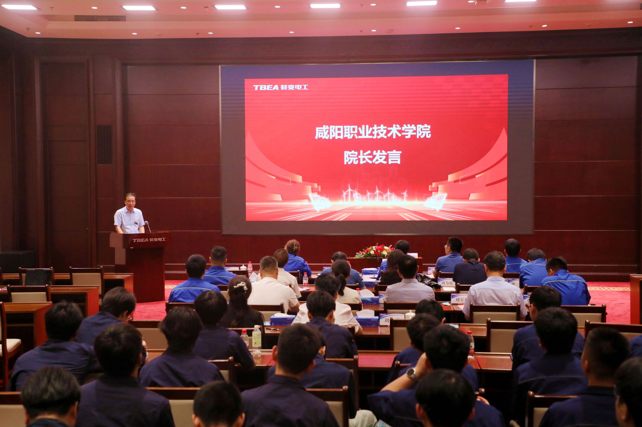 签约仪式上,特变电工新能源公司人力资源总监赵岩致辞,西科公司副总经理史云霞详细介绍了订单班人才培养方案。咸阳职院院长杨卫军表示,特变电工作为国际能源装备制造与系统解决方案领域的领军企业,在科技创新、产业升级和全球能源可持续发展中彰显了行业龙头的责任担当,在输变电设备、新能源装备、光伏发电等领域具有巨大的市场影响力和技术优势。此次签约授牌仪式,是校企双方深化产教融合、实现事业共赢的一次重要实践。希望订单班的同学珍惜宝贵机遇,用好学习实践平台,勤学苦练、砺志成才,努力成为企业的一名正式员工。