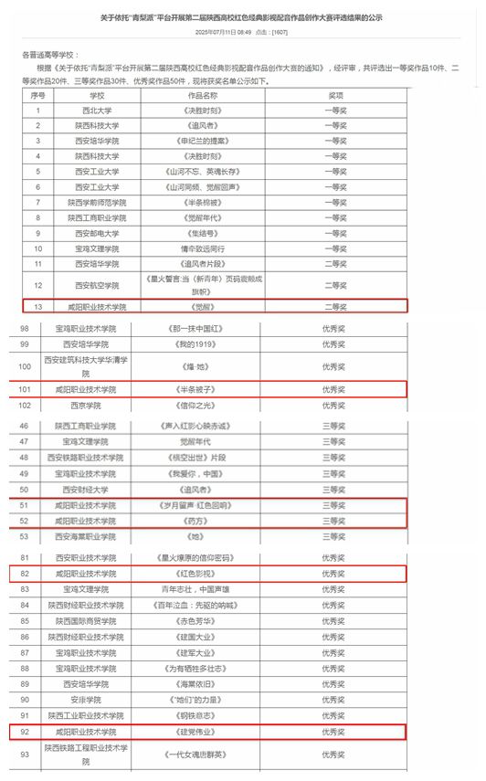 7月11日,陕西高校网络思想政治工作中心发文《关于依托“青梨派”平台开展第二届陕西高校红色经典影视配音作品创作大赛的通知》,公布了大赛评审结果。咸阳职院宣传统战部报送作品斩获佳绩,荣获二等奖1项,三等奖2项,优秀奖3项。其中《觉醒》荣获二等奖;《岁月留声红色回响》《药方》获三等奖;《红色影视》《建党伟业》《半条被子》获优秀奖。