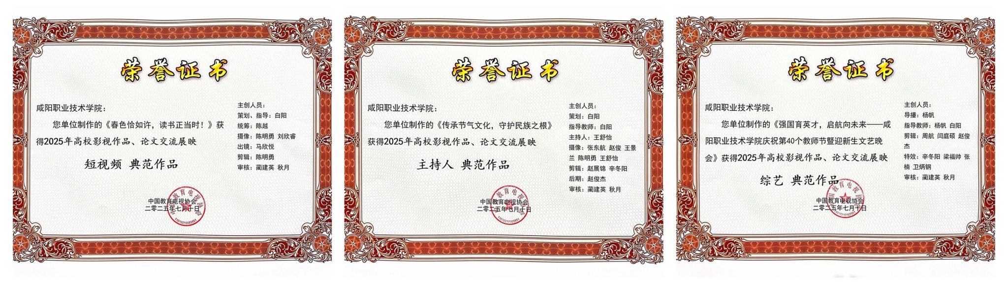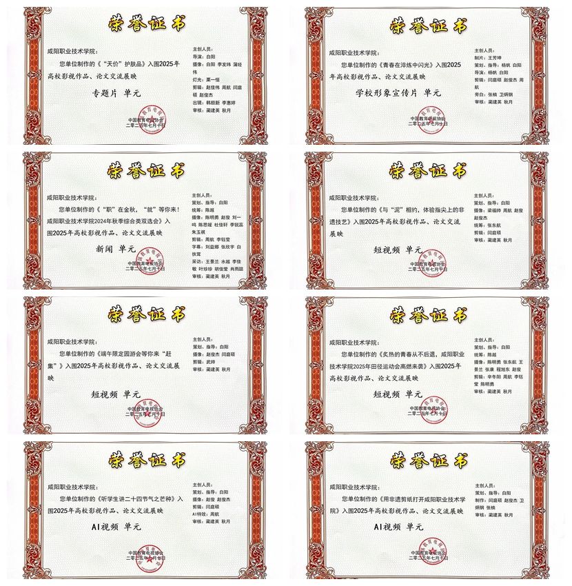 7月10日,由中国教育电视协会指导、中国教育电视协会高校电视专业委员会主办的2025年全体会员大会暨“高校优秀影视作品交流展映”活动在西安工程大学举行。咸阳职院宣传统战部报送11部作品获奖,其中3部获评典范作品,8部获评入围作品。