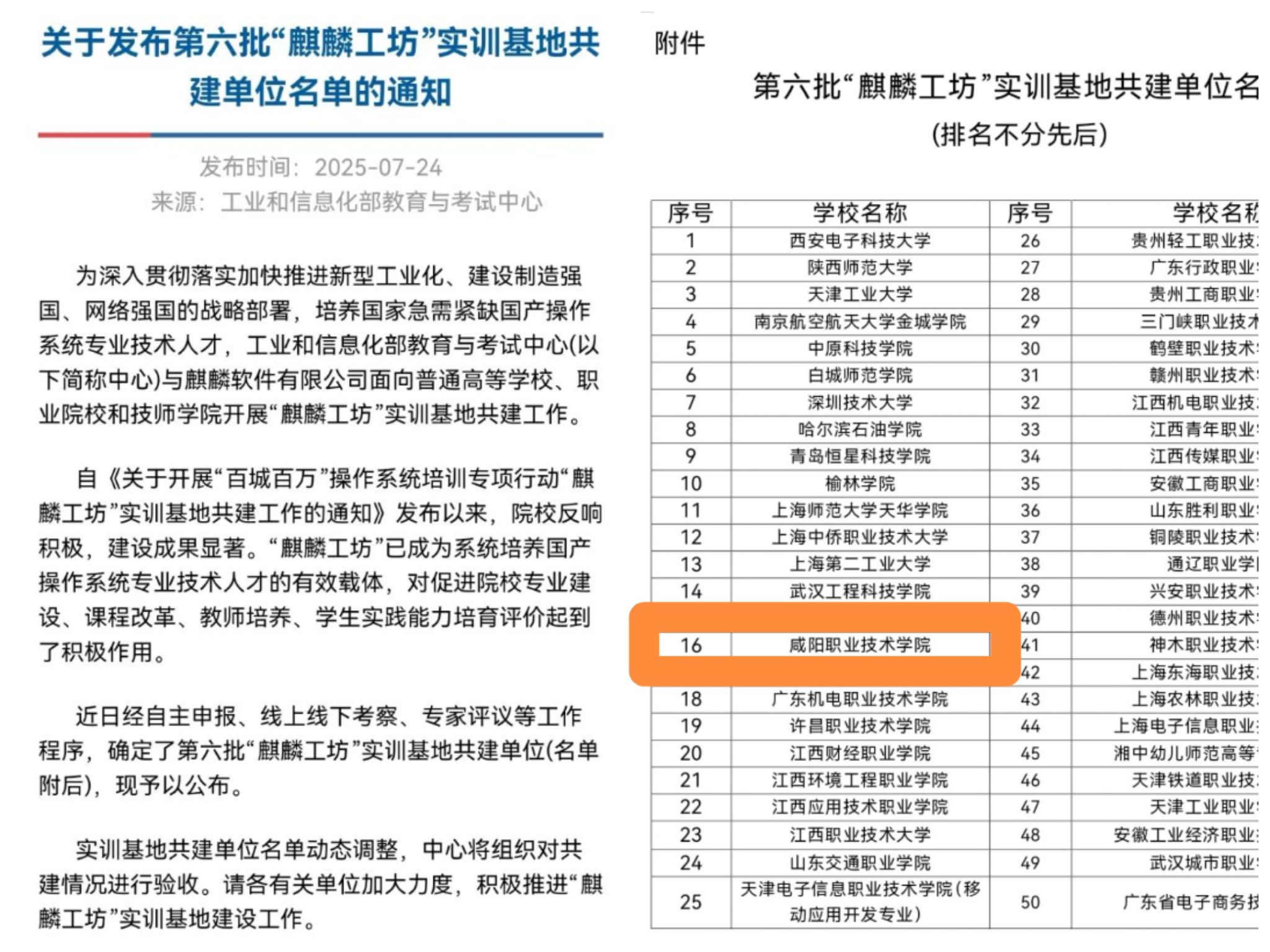 近日,工业和信息化部教育与考试中心正式发布《关于发布第六批“麒麟工坊”实训基地共建单位名单的通知》,beat365正版唯一官网凭借在信息技术领域深厚的办学实力与突出的产教融合成效,成功跻身全国50所获批院校行列,标志着学院在服务国家信息技术应用创新战略与培养高素质技术技能人才方面再获国家级平台支撑。