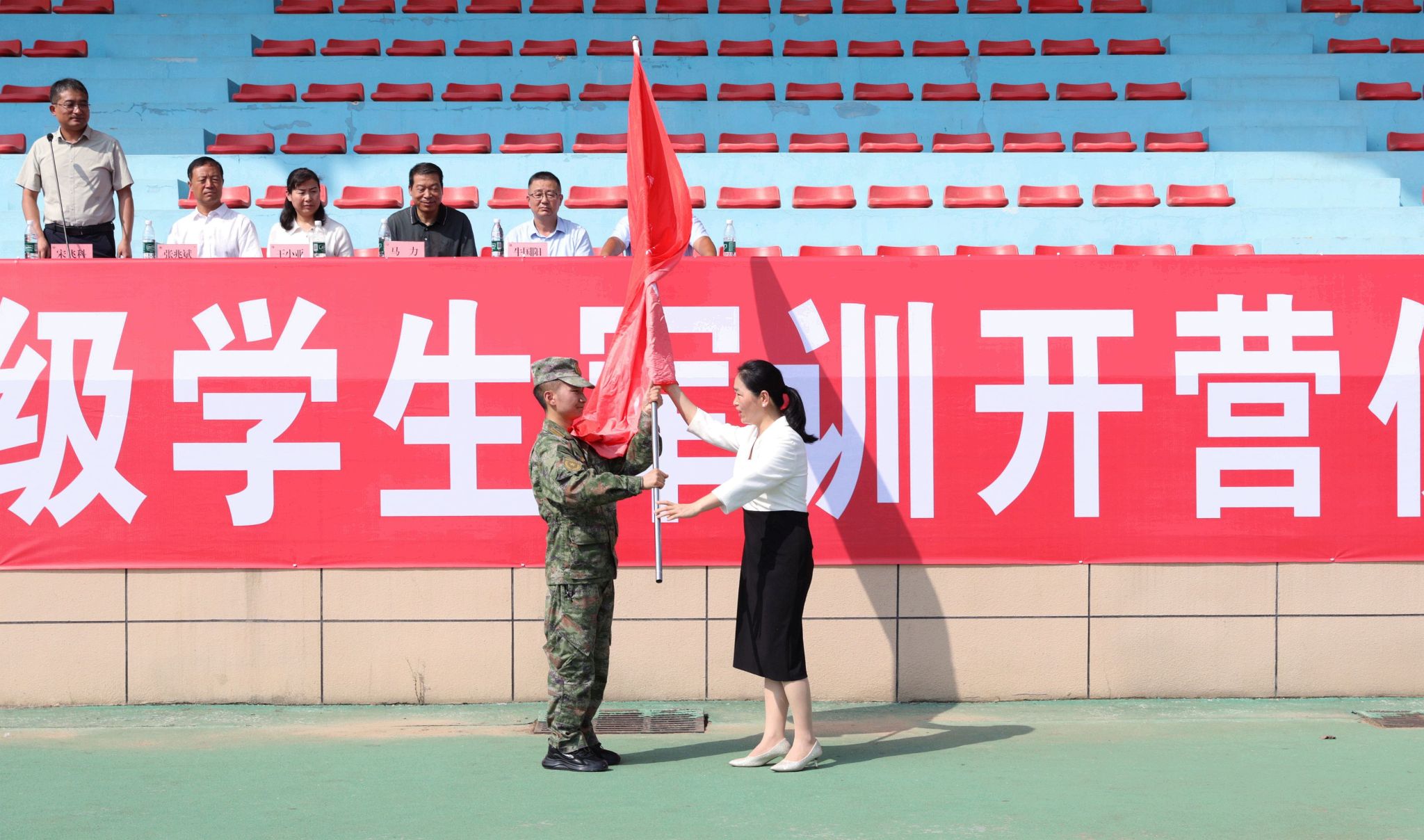 吴旭锦向军训团授团旗,宣布beat365正版唯一官网2025级新生军训正式开始。