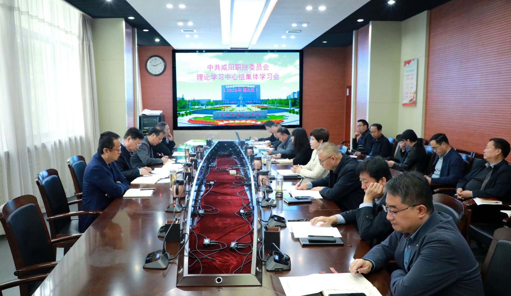 10月16日,咸阳职院党委理论学习中心组召开2025年第8次集体学习会。学院党委书记张迪,院长杨卫军,党委副书记、工会主席孙彦彬,党委副书记赵维,副院长芮红亚、杨新宇,纪委书记王宇文和理论学习中心组全体成员参加学习。党委书记张迪主持会议并讲话。