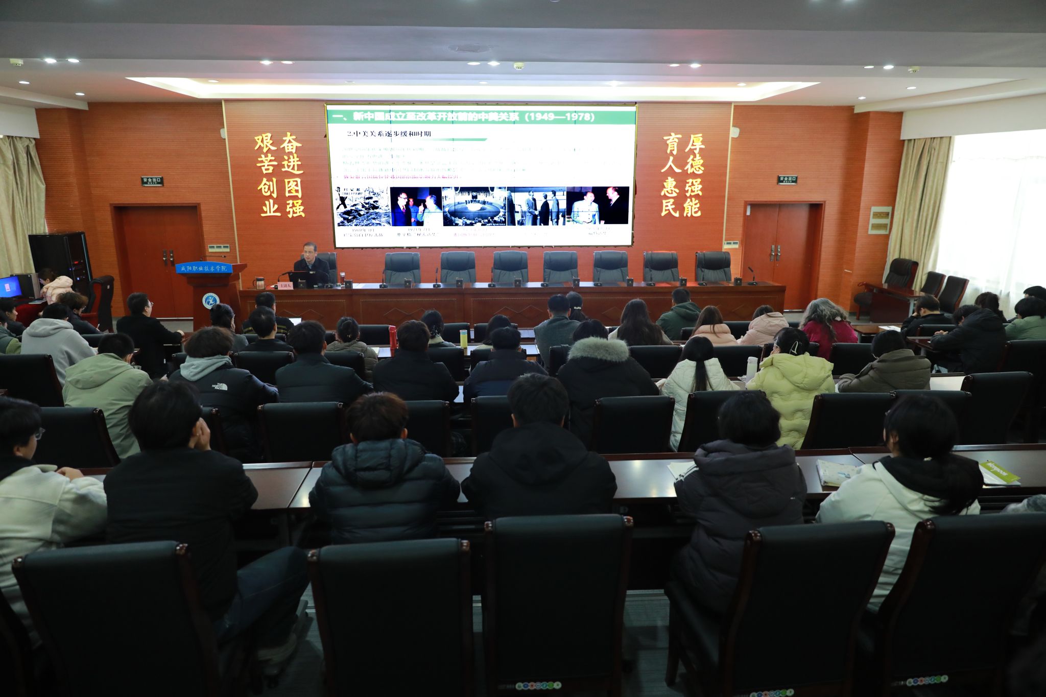 院长杨卫军以“探寻新时期中美两国正确相处之道”为题,以新中国成立至改革开放前的中美关系、改革开放后至党的十八大的中美关系和探寻新时期中美两国正确相处之道三个方面展开授课。通过大量的案例、数据,阐述分析了中美两国关系在不同历史时期的特征与演变,结合大变局下对未来“相向而行”的中美正确相处之道进行了阐释和展望。