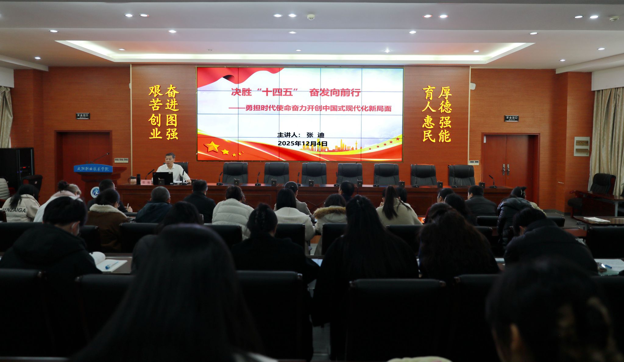 党委书记张迪以“决胜十四五,奋发向前行——勇担时代使命奋力开创中国式现代化新局面”为题,从“十四五”时期我国发展取得的重大成就导入,详细阐释了国家的重大方针政策,让学生由浅入深感受到国家发展过程中涌动的创新潜力、改革动力、开放活力,见证举国上下决战决胜“十四五”的精气神;科学认识“十五五”时期的国内外形势、发展目标和战略举措,坚定实现中国式现代化的信心。
