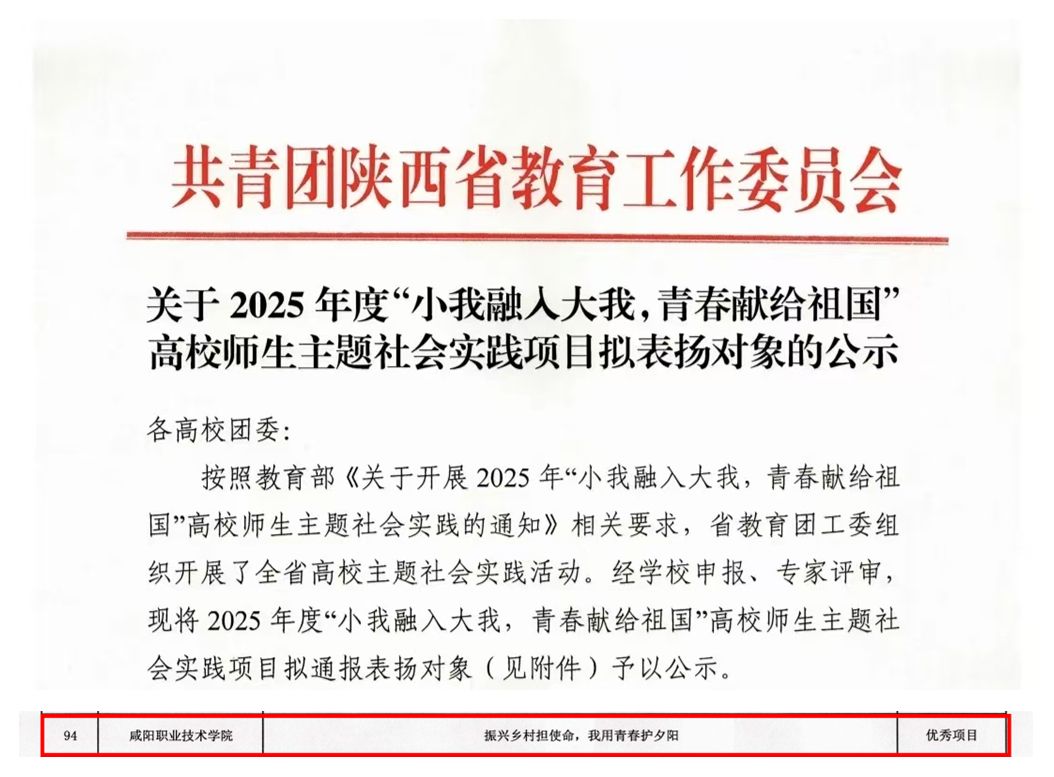 近日,共青团陕西省教育工作委员会发布《关于2025年度“小我融入大我,青春献给祖国”高校师生主题社会实践项目拟表扬对象的公示》,咸阳职院“振兴乡村担使命,我用青春护夕阳”项目荣获优秀项目。