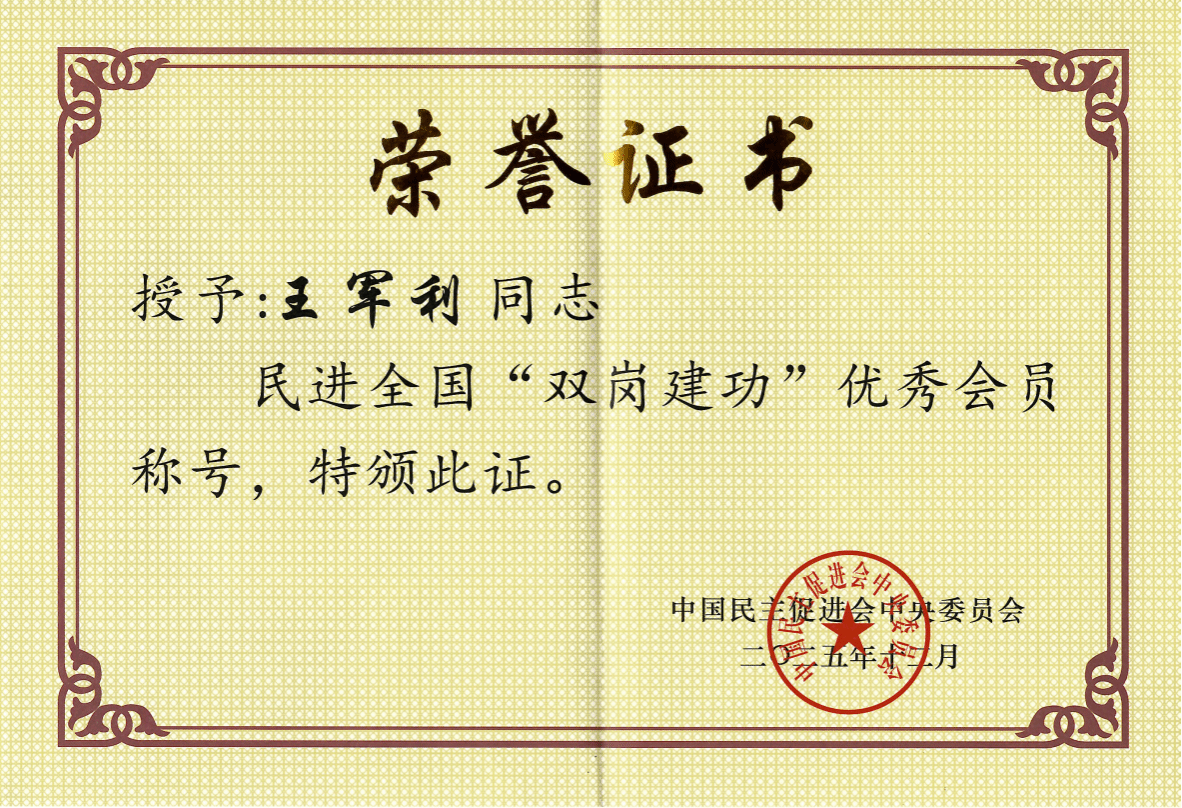 12月9日,庆祝中国民主促进会成立80周年大会在北京隆重举行。为表彰先进、树立典型,激励各级组织和广大会员在新时代新征程上再创佳绩、再立新功,民进中央对过去五年在民进事业中发扬优良传统、认真履职尽责、取得突出成绩、作出重要贡献的76个地方组织、486个基层组织和223名会员进行表彰。王军利在教育教学工作中的扎实成效以及在民进基层组织建设、履职尽责中表现突出,获评民进全国“双岗建功”优秀会员称号。