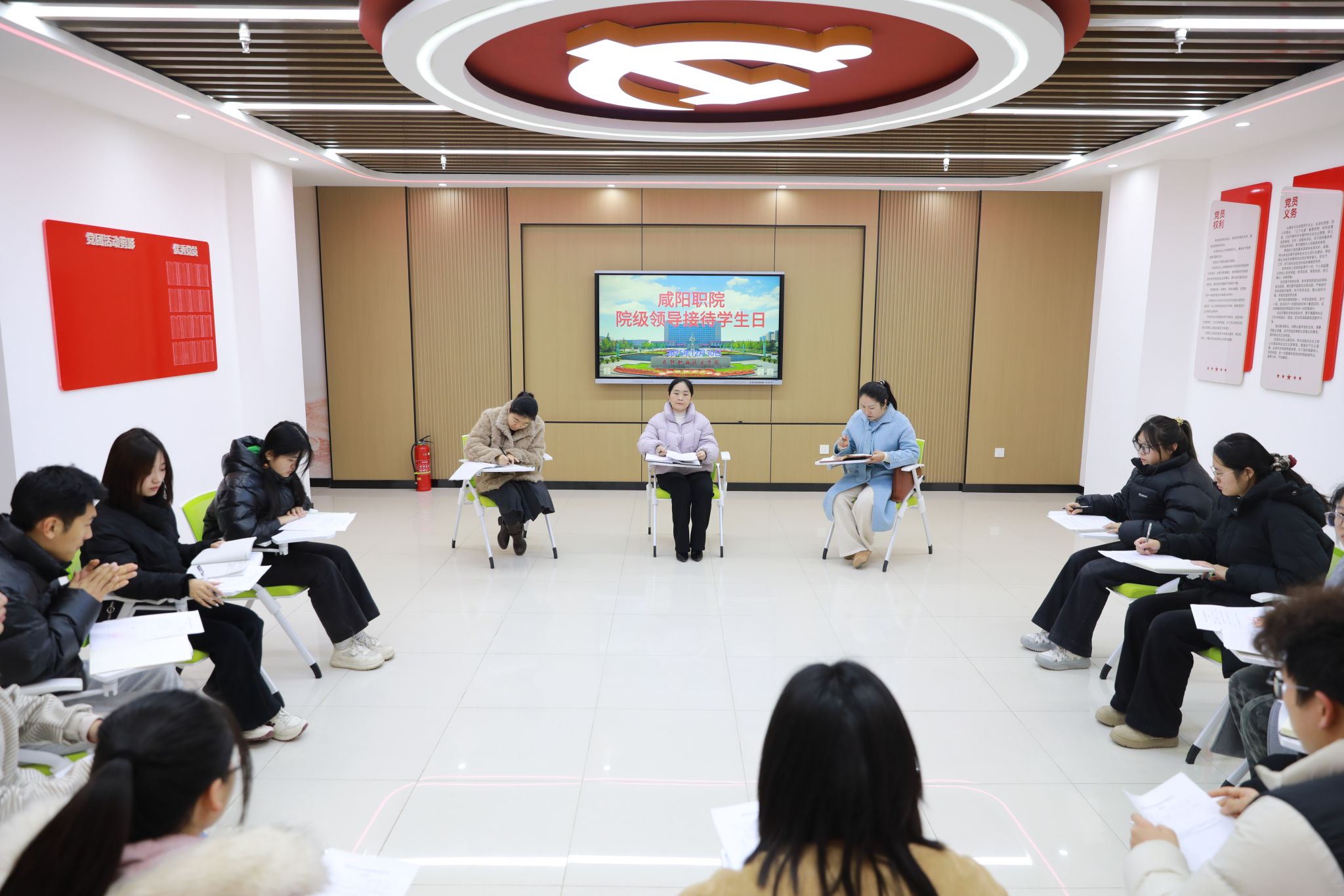12月30日,咸阳职院副院长吴旭锦在学院“一站式”学生社区学生党团活动中心与来自11个二级学院的学生代表面对面交流,倾听心声、共话成长。学院团委负责人陪同参会。