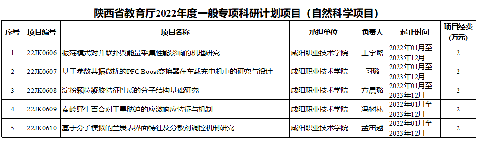 近日,陕西省教育厅公布了《关于印发2022年度科研计划的通知》(陕教函〔2022〕796号),咸阳职院5项课题获一般专项科研计划项目立项。