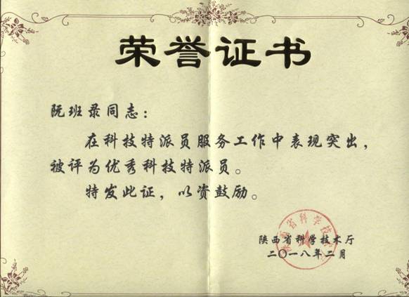 咸阳职院阮班录教授因近年来在农业技术推广方面的突出成绩,被认定为省级科技特派员,并获评“陕西省优秀科技特派员”。